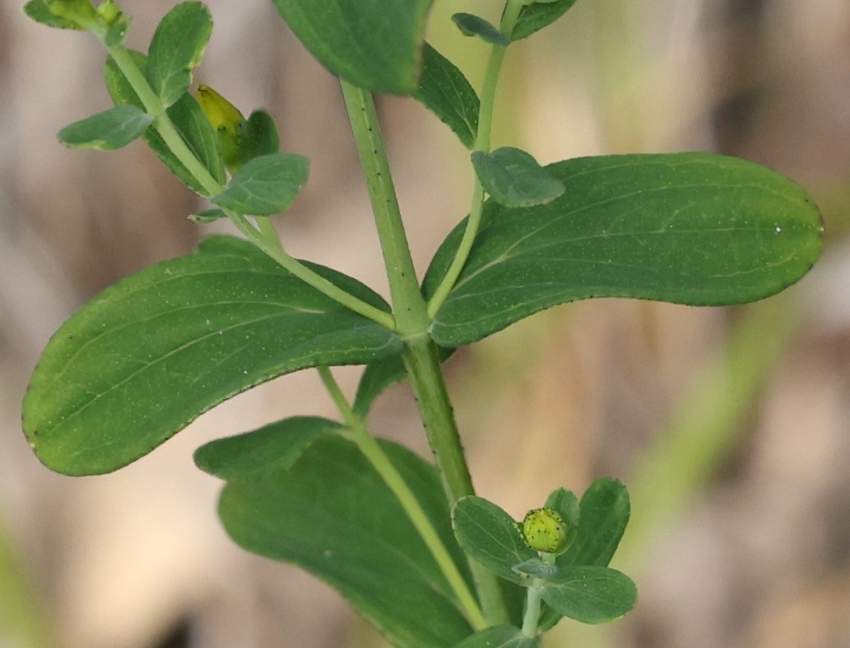 茎は細くてかたく、2本の稜があり稜上に黒点がまばらにある。葉は質がやや厚く卵状楕円形、鈍頭、基部は円形、無柄、明点が密にあり、辺縁に黒点がある。茎の上部では葉腋から枝が出る。