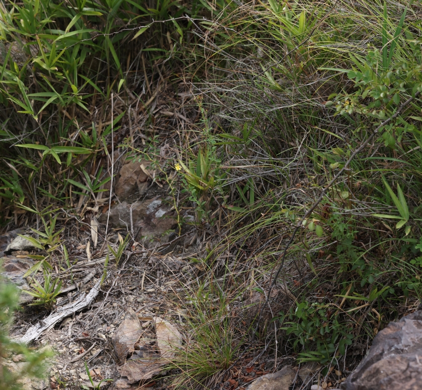 なんでわざわざこんな乾燥した場所に生育するように進化したのか、変に感心した。また、オトギリソウ属の種は区別が難しいものが多いが、トサオトギリは花の花弁の先がトモエソウの花のように曲がっていること、茎が細いこと、乾燥した急傾斜の岩角地が生育地であることなどから初見でも同定が容易であった。