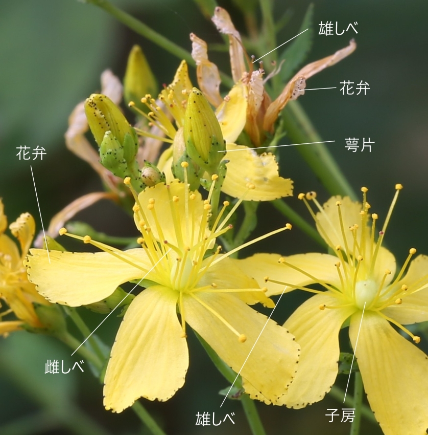 基部は円形~広いくさび形、無柄、明点が密にあり、辺縁には黒点がある。茎頂や上部の枝の先に集散状の花序をつけ、花は径15~18㎜、鮮黄色赤みを帯びた脈がある。花柄は長さ2~3㎜。萼片は5個