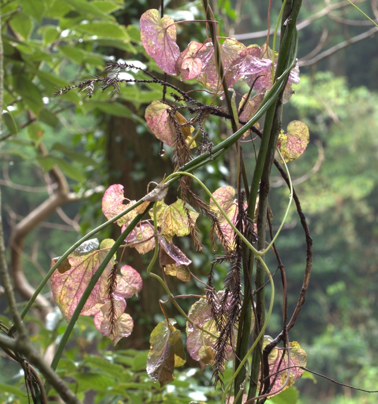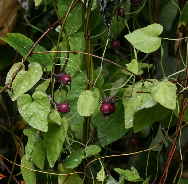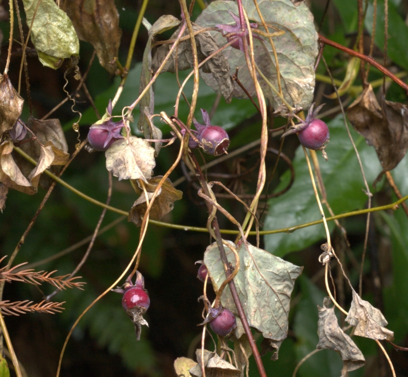 他のツル性植物に絡んで茎を伸ばしている個体。葉は元気なく枯れ始めているように見えるが、たくさんの赤紫色の果実を付けている。