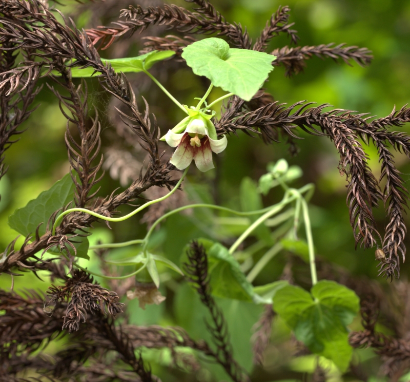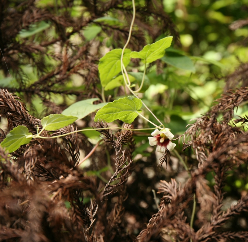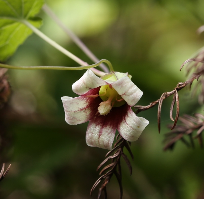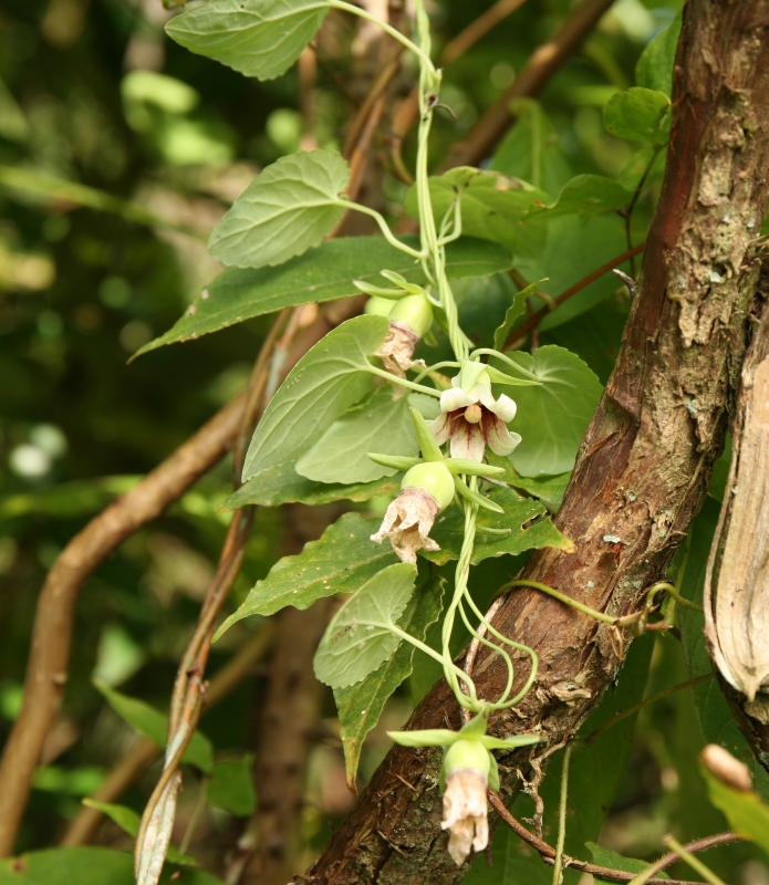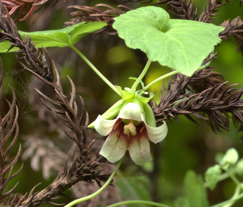 花は葉腋に1個つき長さ1~2cmの柄があり垂れ下がって開花する。茎は細く無毛で、他の植物や枯木などに緩やかに巻き付きながら伸びる。