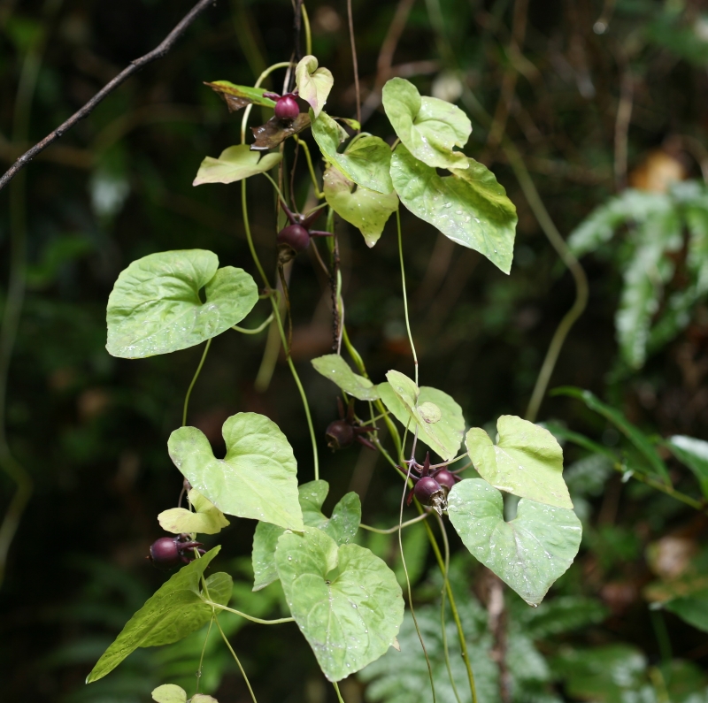 この個体は熟したようにみえる赤紫色の液果の果実をつけているが、葉は淡緑色でまだ枯れていない。葉はハート形で若い葉の裏面は粉白色を帯びる。