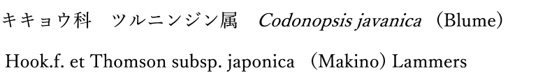 雑感:ツルニンジン(ジイソブ)の仲間で、見たいと思っていたがなかなか出会えなかった種である。ツルニンジン属だけあって根茎は小さいニンジン状である。ジイソブやバアソブの