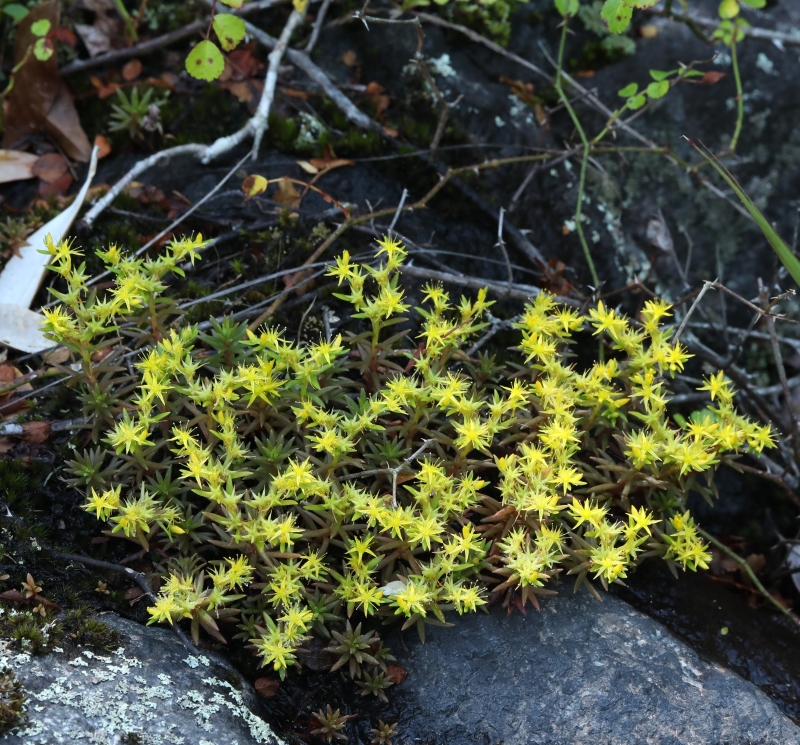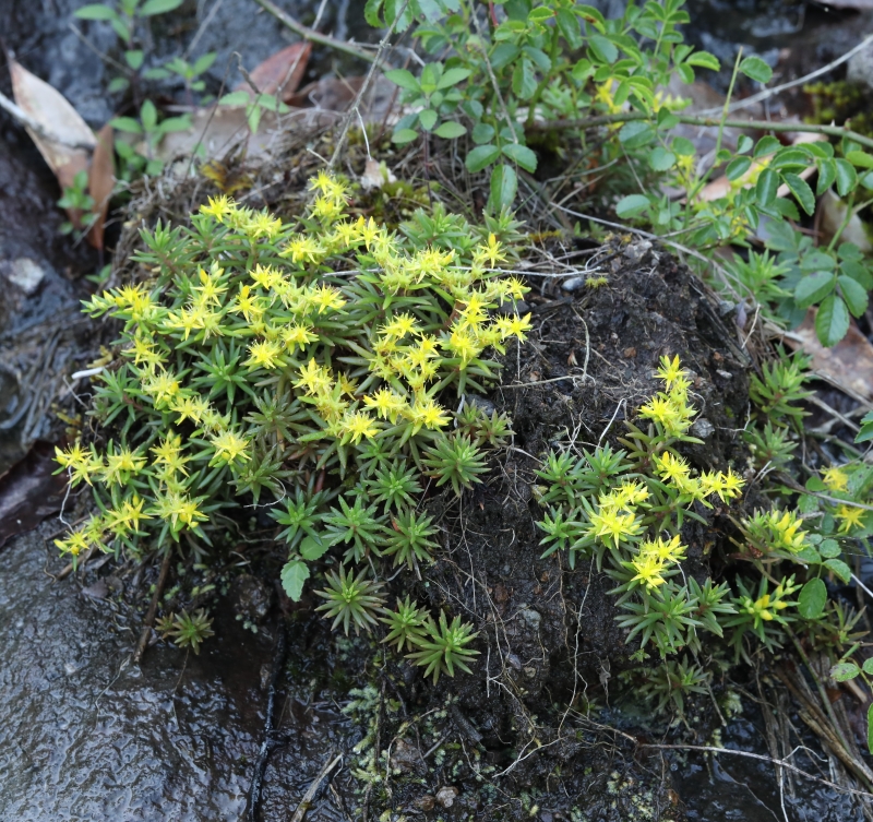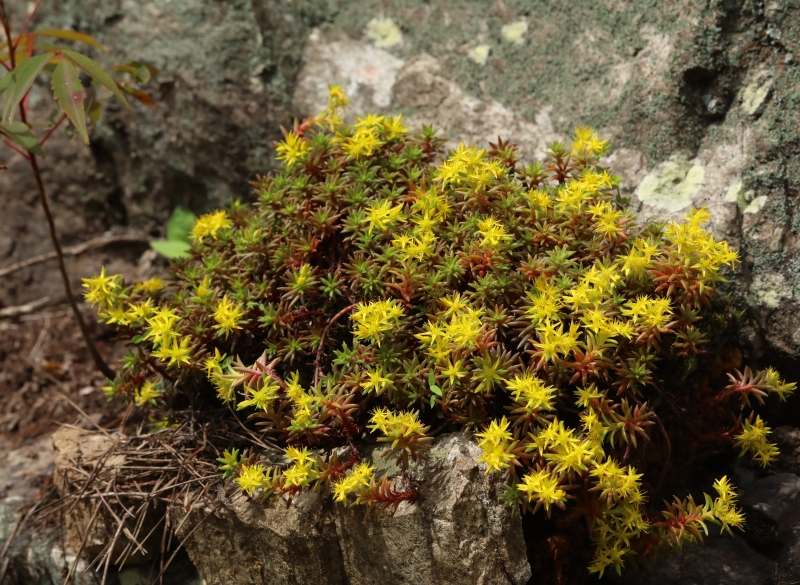 ウンゼンマンネングサは故郷の低山の岩場にあったが、開花した個体を見たのはずいぶん経ってからであった。低山の中腹にある開けた滝の落ち口の岩上に咲く黄色い花は人目を引くが
