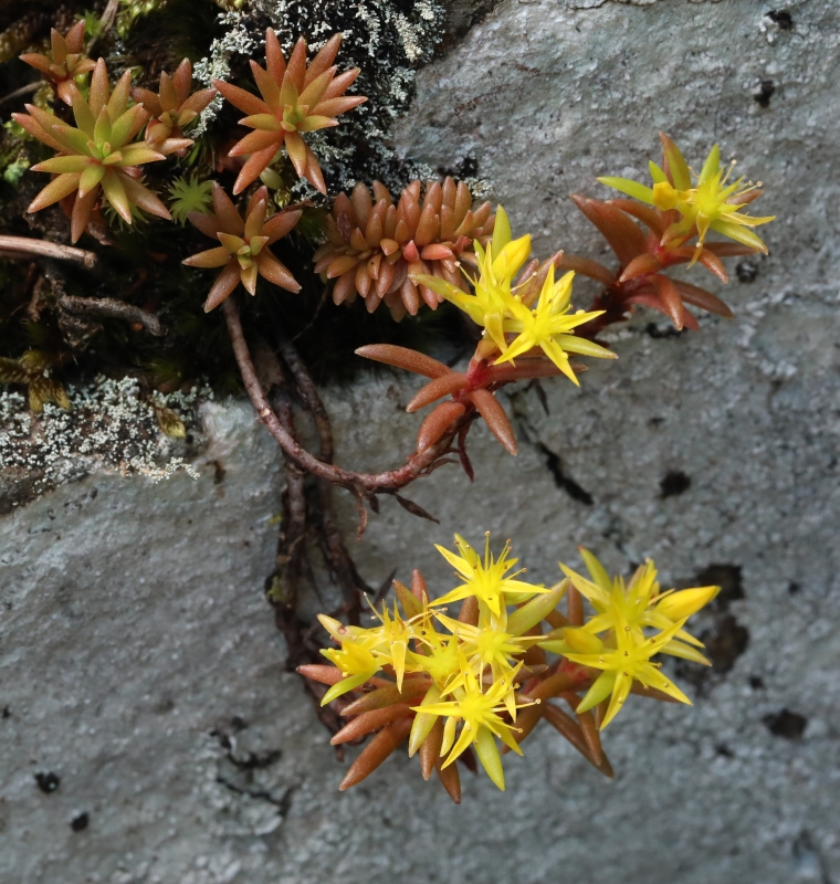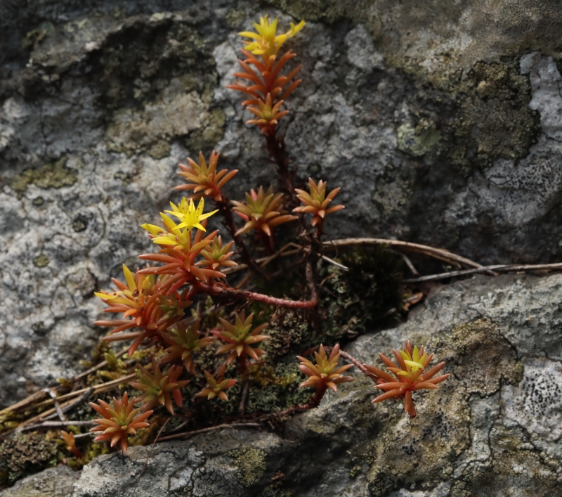 典型的なウンゼンマンネングサで日のよく当たる岩の隙間に根をおろし茎の上部は赤褐色で先に黄色の花を開花させ、赤褐色の葉を展開している。