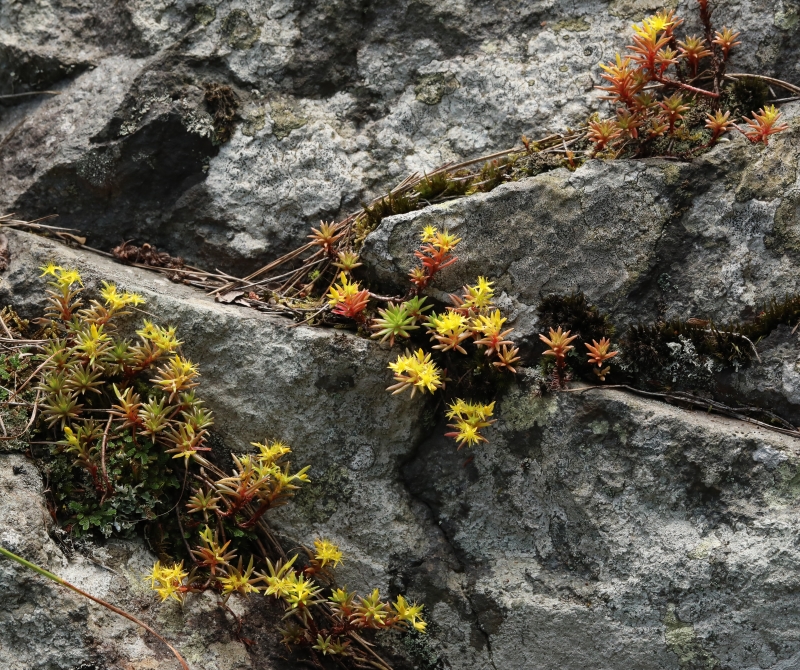 明るくよく風の通る岩場に密生している。灰褐色の岩肌を背景に黄色の花、一部に緑色が混じった赤褐色の葉の構図は見飽きない。