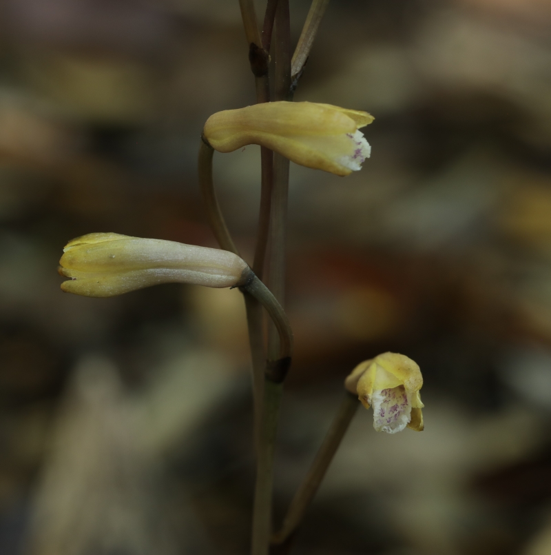 黄褐色の茎には3~4個の長さ4~6㎜の鱗片葉互生する。花は茎の上部に2~6個付き、淡黄褐色の筒状で半開する。萼片、側花弁は倒披針形で約15㎜、唇弁は白色で長さ約12㎜で3裂する。唇弁の中裂片の内側には淡紫色の