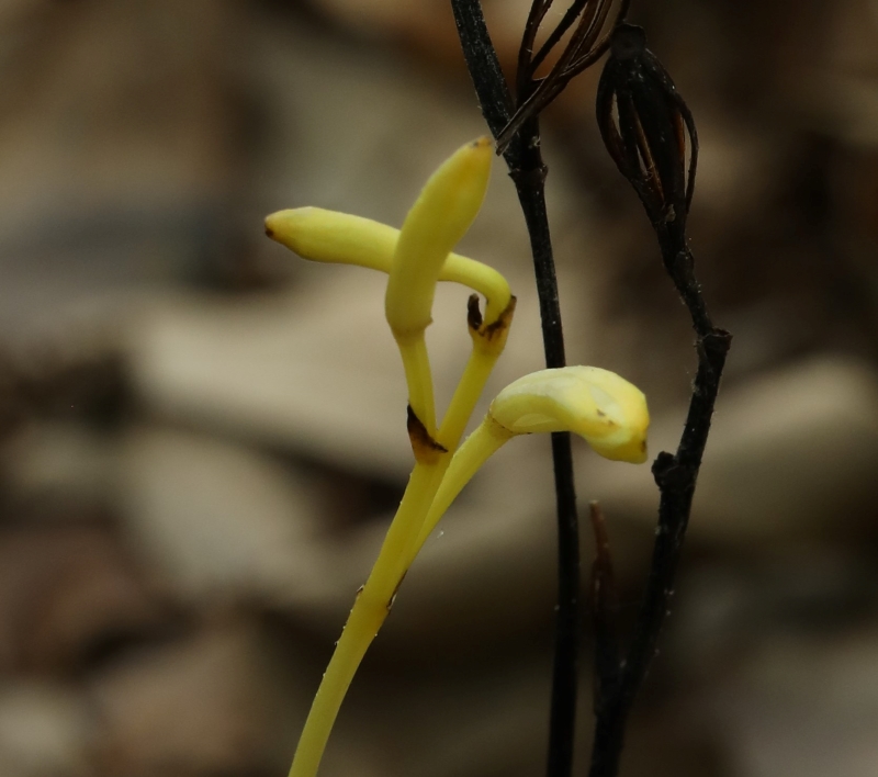 3個の閉じた黄白色の筒状の花で、枯れて黒く変色した鱗片葉もわかる。後方に種を散布した後の黒色の枯死した蒴果が見える。