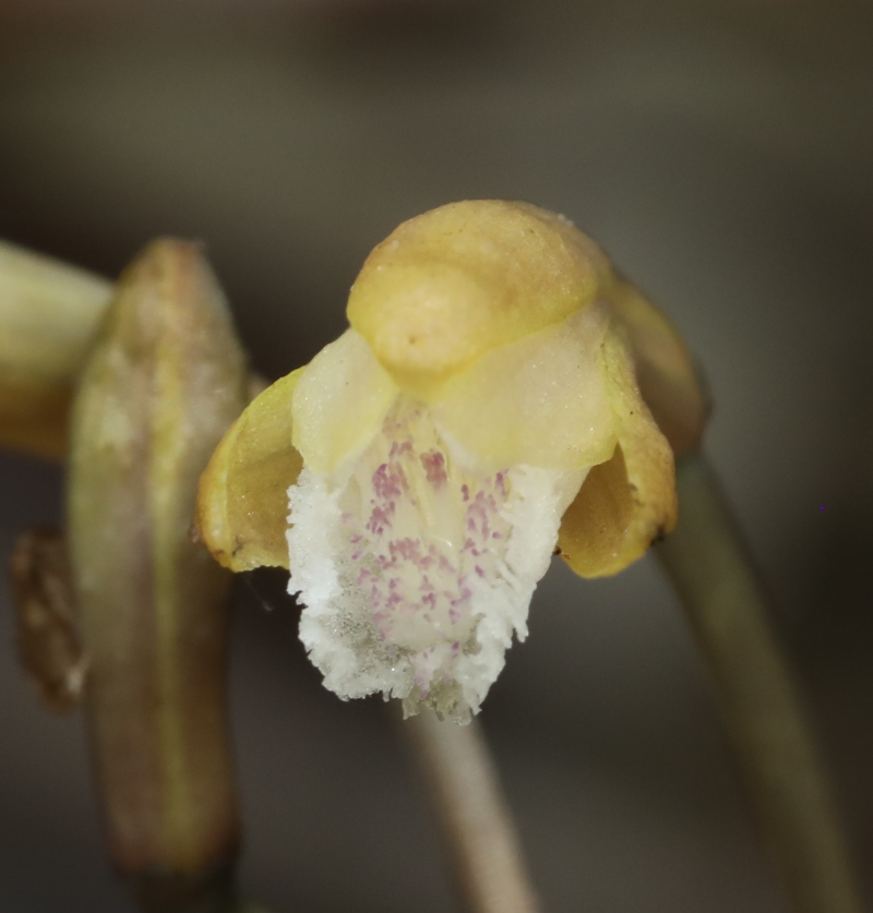 ままの状態で多数みられた。花は半開した先の唇弁の中裂片の淡紫色の毛状突起がやはり印象的で、半開の花であるがつつましやかで上品な花である。ムヨウラン類は生育場所が薄暗い林床であるためか