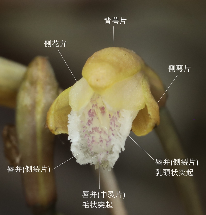 ラン科植物の花の構造としては標準的であるが、唇弁の先端部が3裂して中央の中裂片の淡紫色の毛状突起が特徴的である。また、蕊柱は花被片の奥に隠れて見えない。