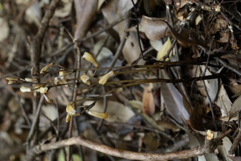 シイ類の古木が多い林床に生育している個体。この場所では最大級の株立ちの個体の1つである。淡黄褐色の筒状の花を多数つけているが、