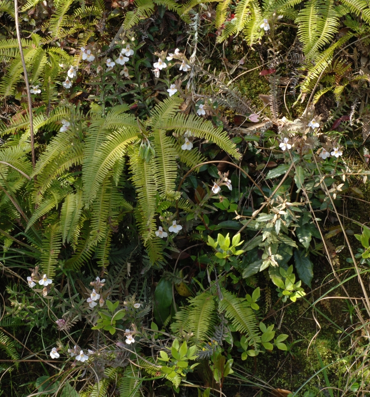 明るい日陰に群れて咲く株。細い茎に対生する線状長楕円形葉を多数つけて斜上し、茎の上部の葉腋に花をつけている。日陰であるためか、葉の緑色が濃いように見える。