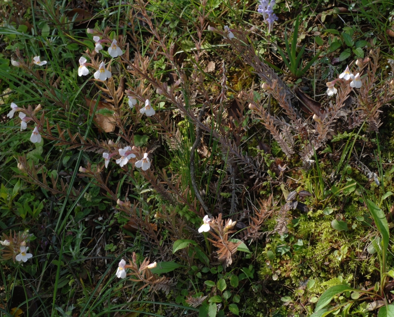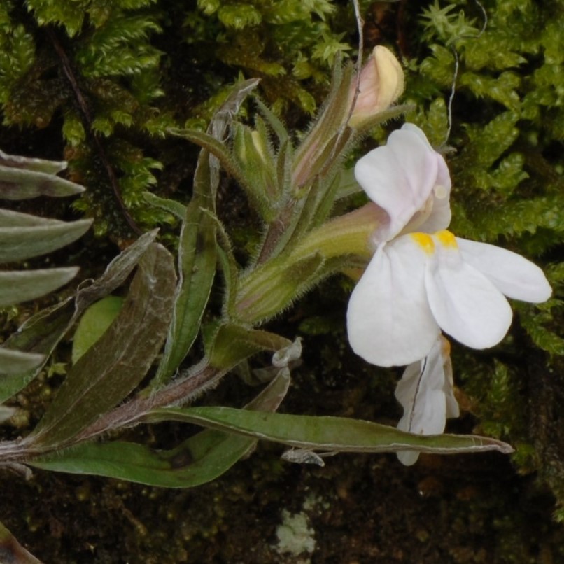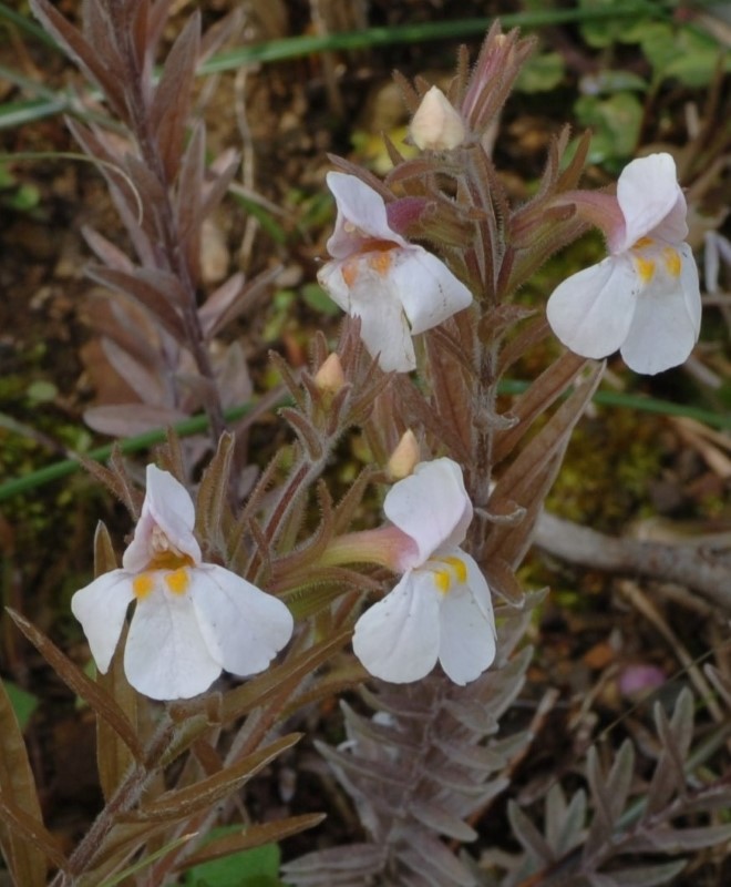 ・特徴 :半寄生の2年草。根ぎわで分枝して株となり、茎は斜上して高さ15~25cm、葉には白い綿毛を密生する。茎の上部の葉は線状長楕円形または倒披針形で先はとがり、長さ5~25㎜、幅1.5~4㎜で対生する。