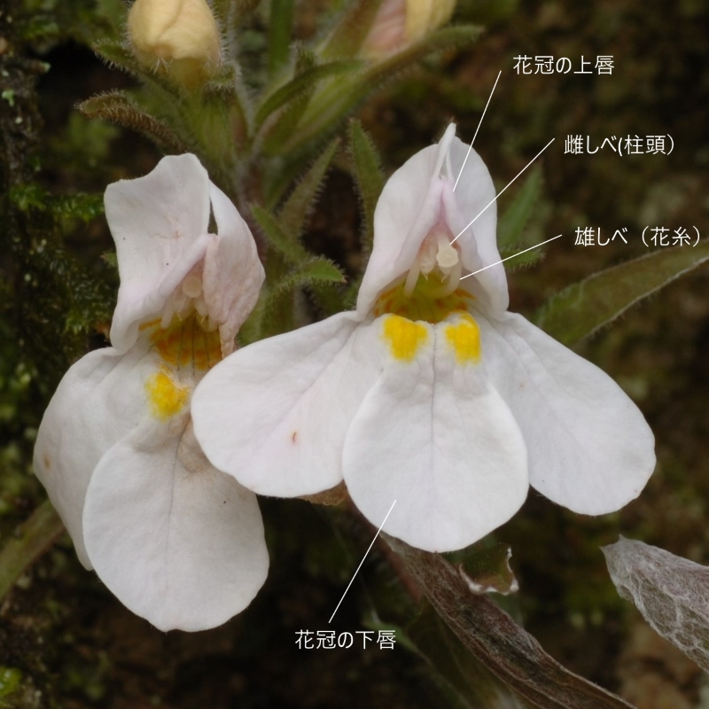 花冠の白色の下唇の中央の黄色い大きな点は訪花昆虫へ蜜標なのであろうか、印象的である。