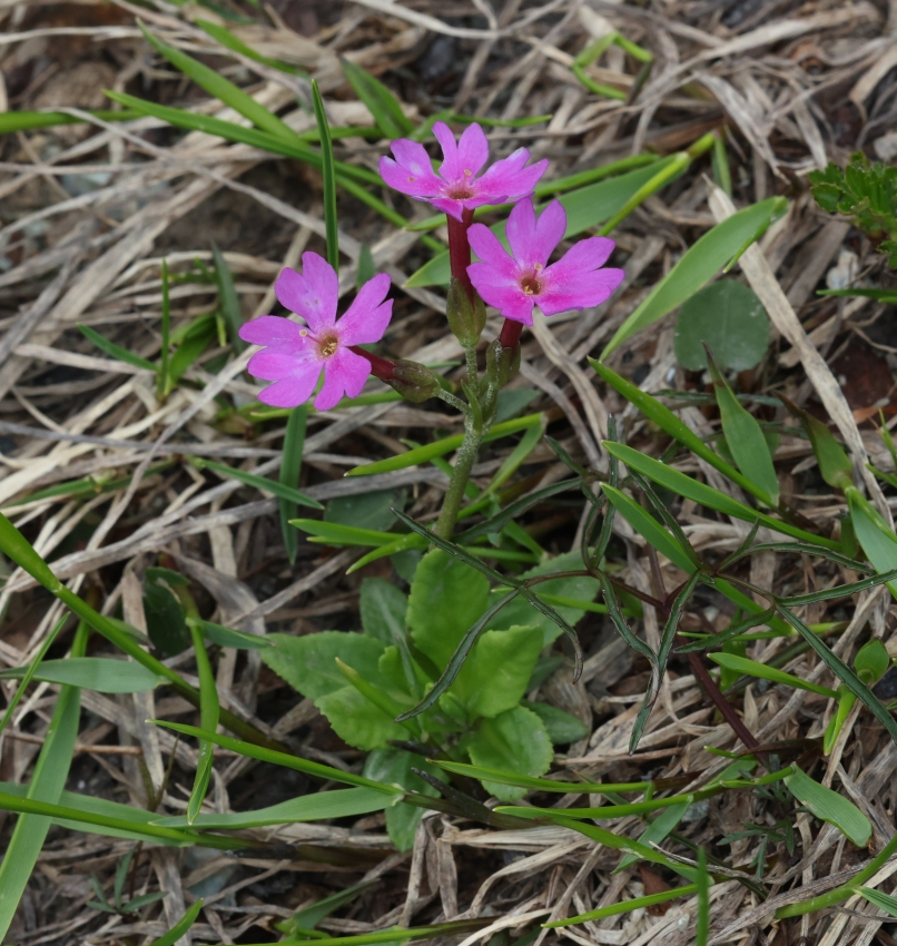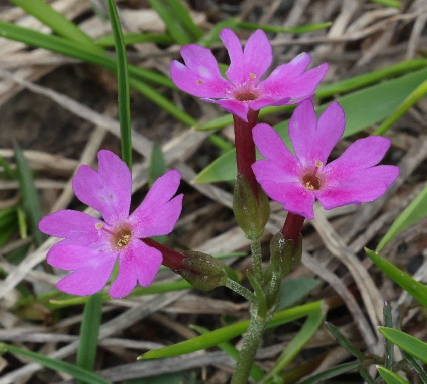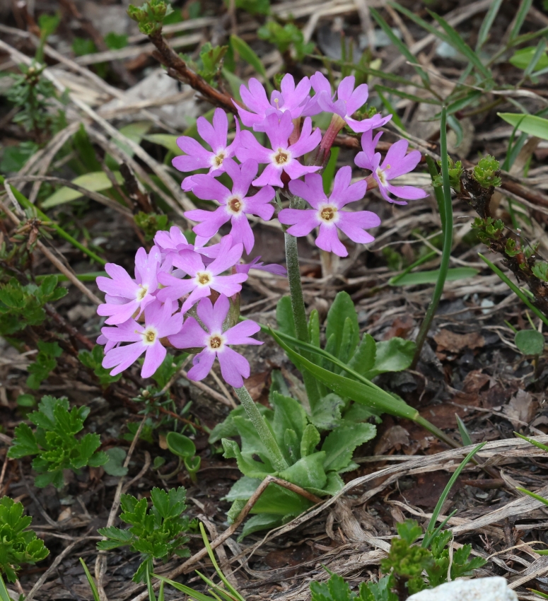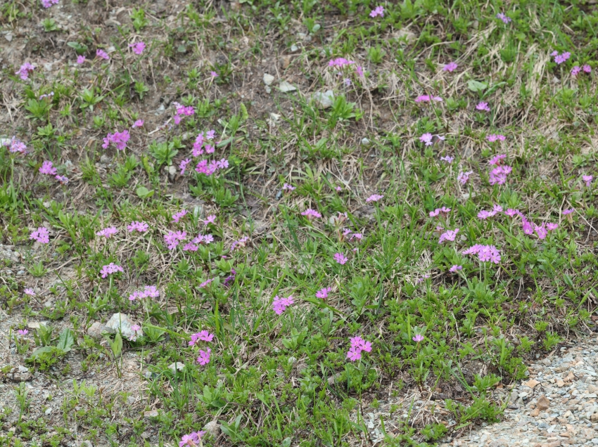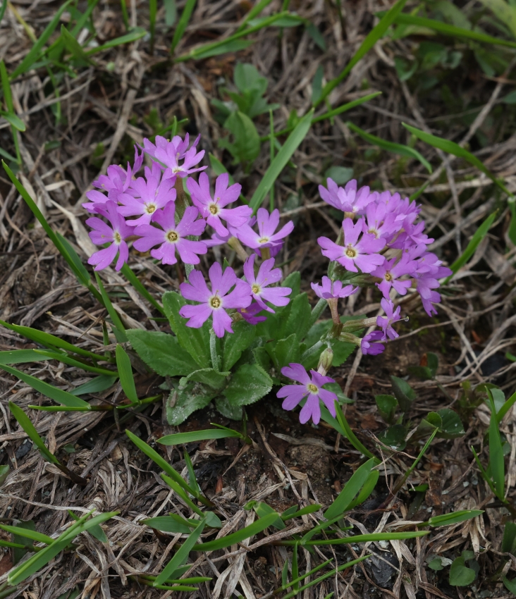 ここには5個の花茎があり、3個の花茎には2~4個の花がつき、2個の花茎には8個ほどの花がついている。ふつうユウバリコザクラは1~4個の花を花茎につけるので、8個の花は多い。