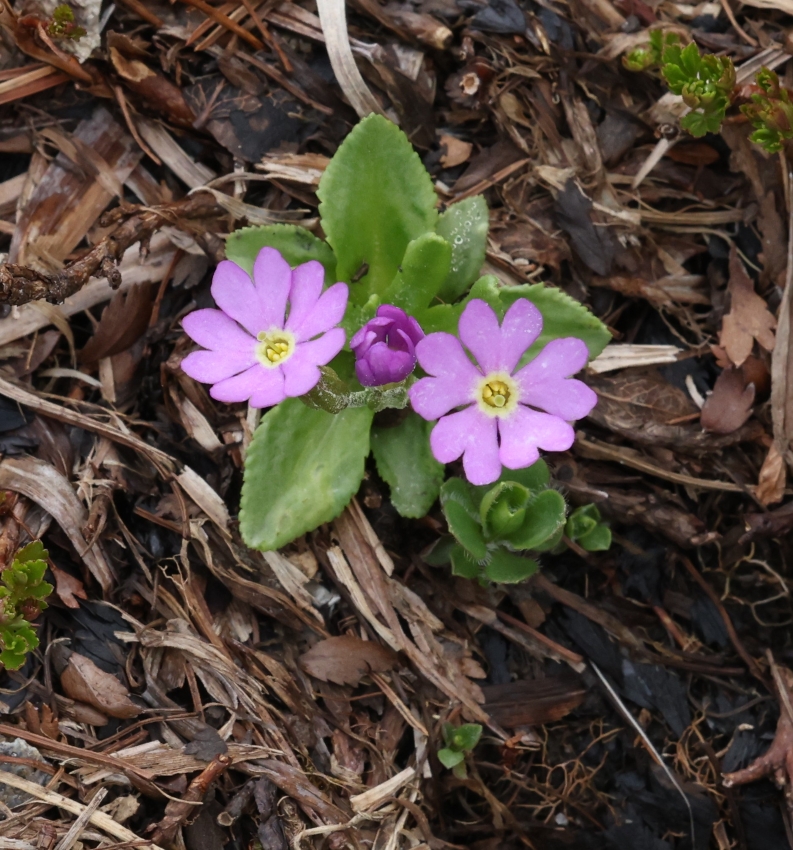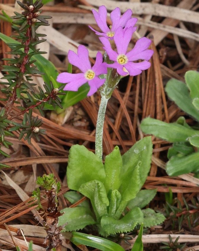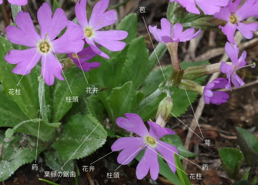花茎の高さ約10cm、2個の花茎ともに8個ほどの花をつけ、通常の1~4個より多いが、この個体も葉、花茎、花などユウバリコザクラの特徴を持っている。