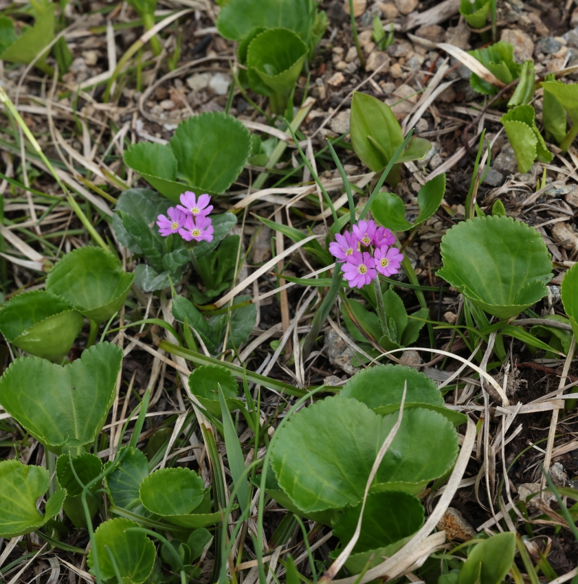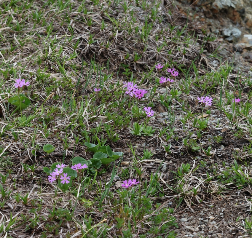 草丈(花茎)も小さく、花茎の花の数は1~4個で典型的なユウバリコザクラが点在する風景であり、緑の丸い葉は湿った土壌を好むイワイチョウである。