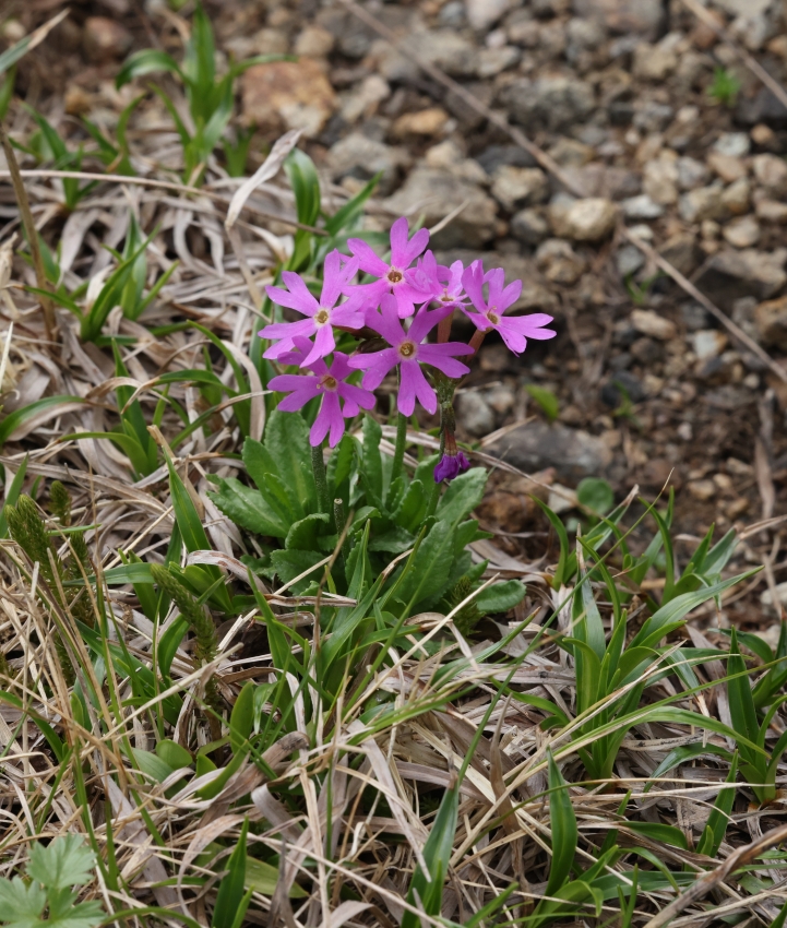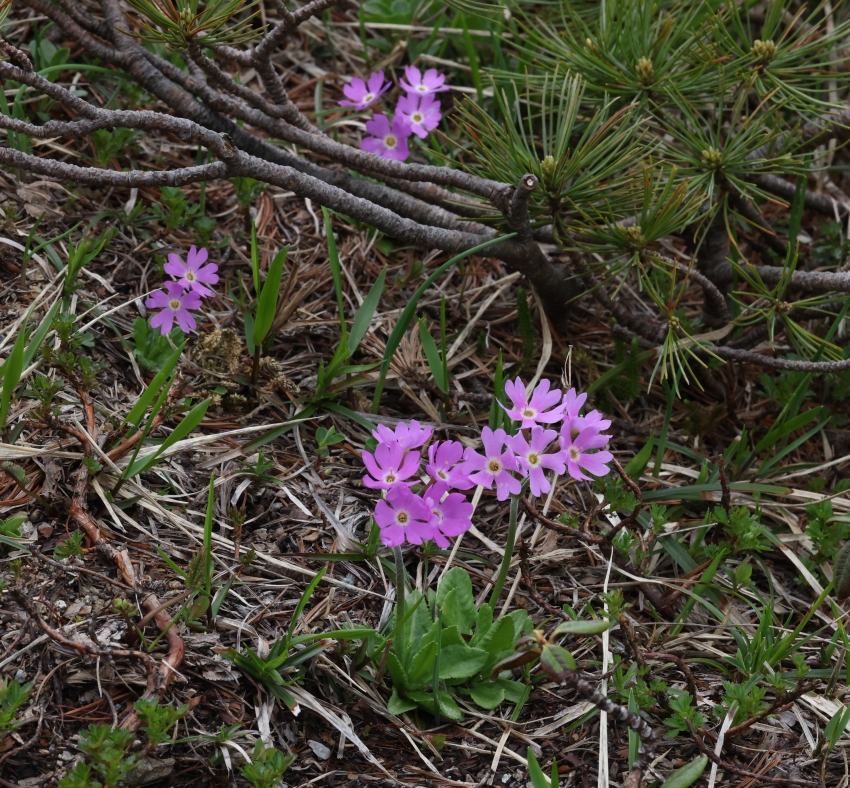 雪田の雪が解けた跡に開花したユウバリコザクラ。3個の花をつけた高さ約7cmの個体。
