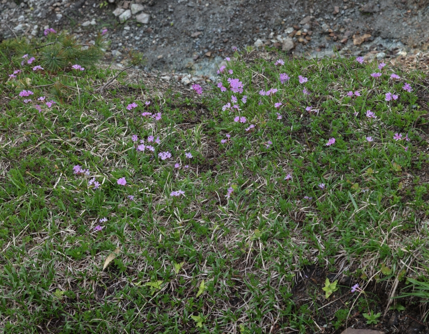 蛇紋岩の崩壊地の下方にできた雪田の雪が溶けて跡の草地に群生して花を咲かせている。花茎を含めた草丈が低く、花は1つの花茎に1~4個と少ない。画像下部に点在する黄緑の葉はムシトリスミレである。